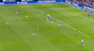 西甲第9轮,马竞主场1比0小胜奥萨苏纳,排名升至第4位。第9分钟,阿尔瓦雷斯销魂直塞助攻巴埃纳首开纪录,但主裁判观看回放后判定格列兹曼阻挡后卫犯规(图②),进球无效。第63分钟阿尔马达复出换下巴埃纳;第69分钟,朱利亚诺·西蒙尼右路突破下底传中,阿尔马达门前包抄打入全场唯一进球(图③)。